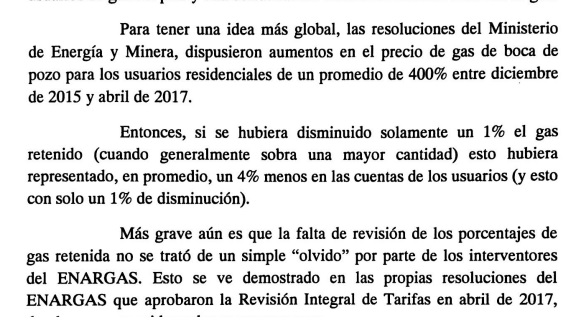Se trata del “gas combustible”, que se les cobra a todos los usuarios en la tarifa, pero que, según la denuncia, se usa mucho menos de lo que se factura. Las distribuidoras de gas (como Ecogas) tienen incluido en la tarifa el precio del gas que se usa como combustible en las plantas compresoras que transportan ese recurso. Ese gas es una especie de excedente que se usa como insumo del sistema y lo pagan los usuarios. En base a un cálculo que no es preciso, las empresas facturan un 7% más del gas que se demanda. Es decir: si todo Mendoza consume 100, en realidad se paga por 107.