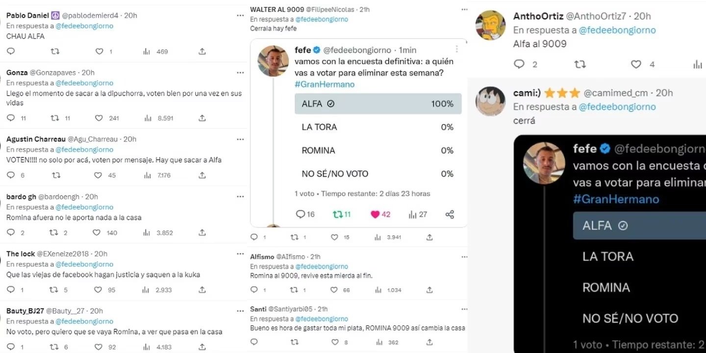 En las redes, especialmente en Twitter, como en cada semana, se abrió un debate de quién será el próximo en abandonar la casa más famosa del mundo. Por lo cual, varios influencers de la plataforma de debate más conocida realizan encuestas para saber qué es lo que opinan los fieles seguidores de Gran Hermano.