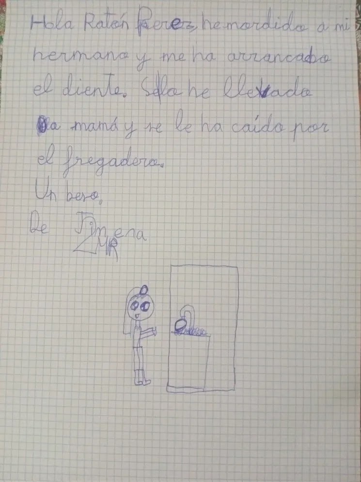 “Hola Ratón Pérez, he mordido a mi hermano y me ha arrancado el diente. Se lo he llevado a mamá y se le ha caído por el fregadero. Un beso. De Jimena”, escribió la niña.