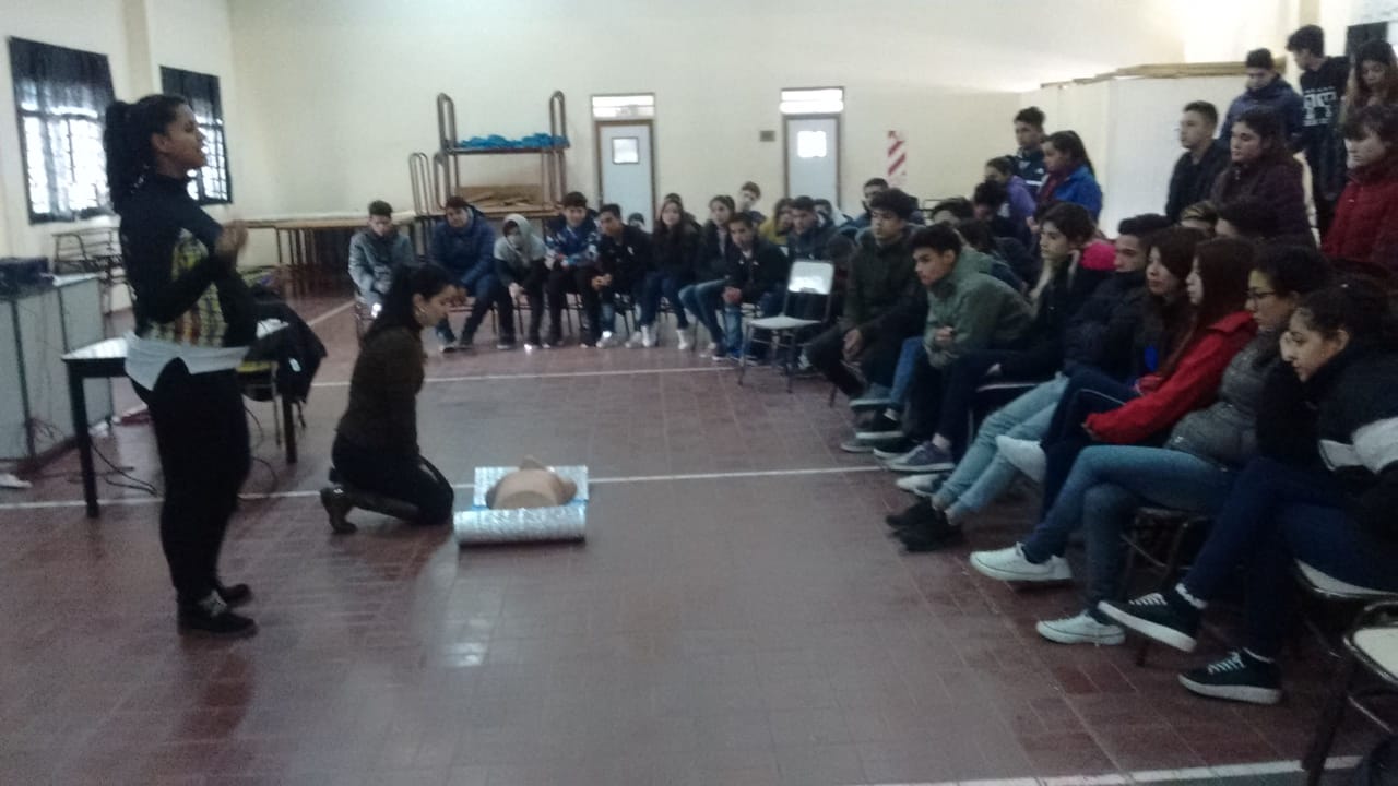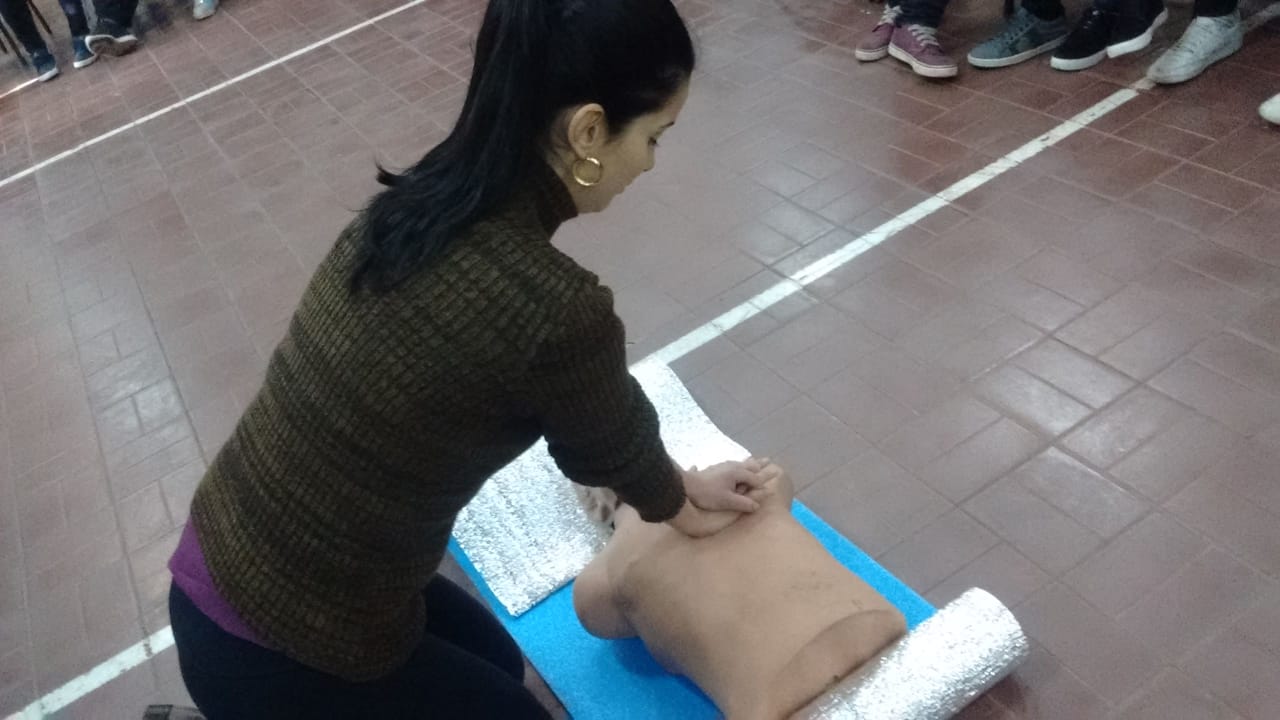 La primera charla teórico – práctica se dictó en la escuela Islas Malvinas del barrio Unimev y trató el tema de la Resucitación Cardiopulmonar. Al momento de la práctica, se utilizó un maniquí que hizo las veces de paciente con una afección cardíaca.