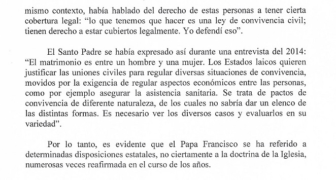 “Una pregunta sucesiva era, en cambio, inherente a una ley local de hace diez años en Argentina sobre los matrimonios igualitarios de parejas del mismo sexo y a la oposición del entonces Arzobispo de Buenos Aires al respecto”, afirmó.