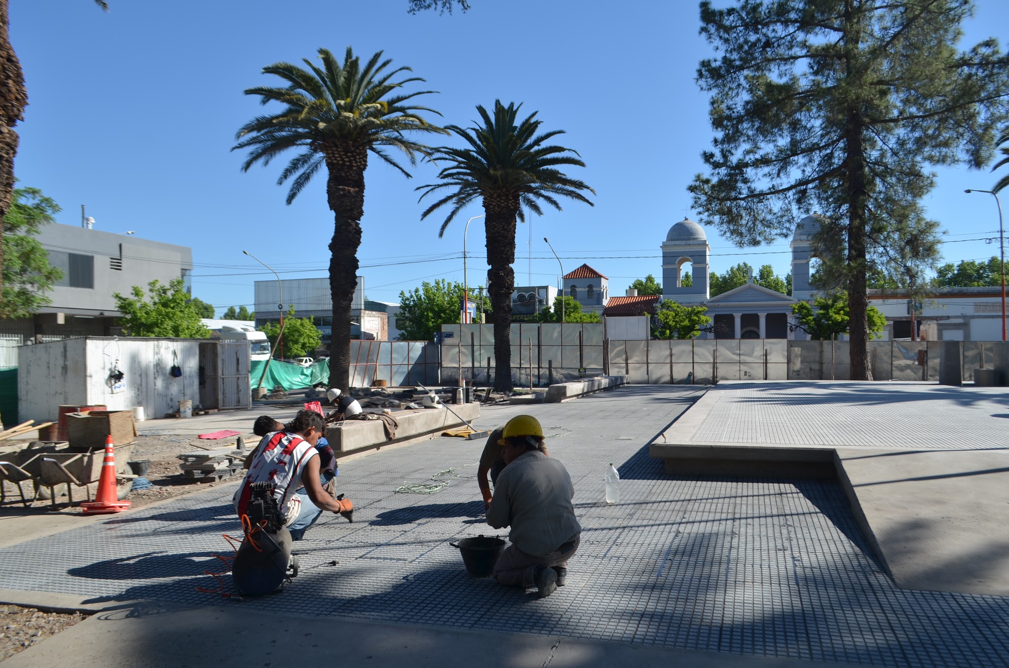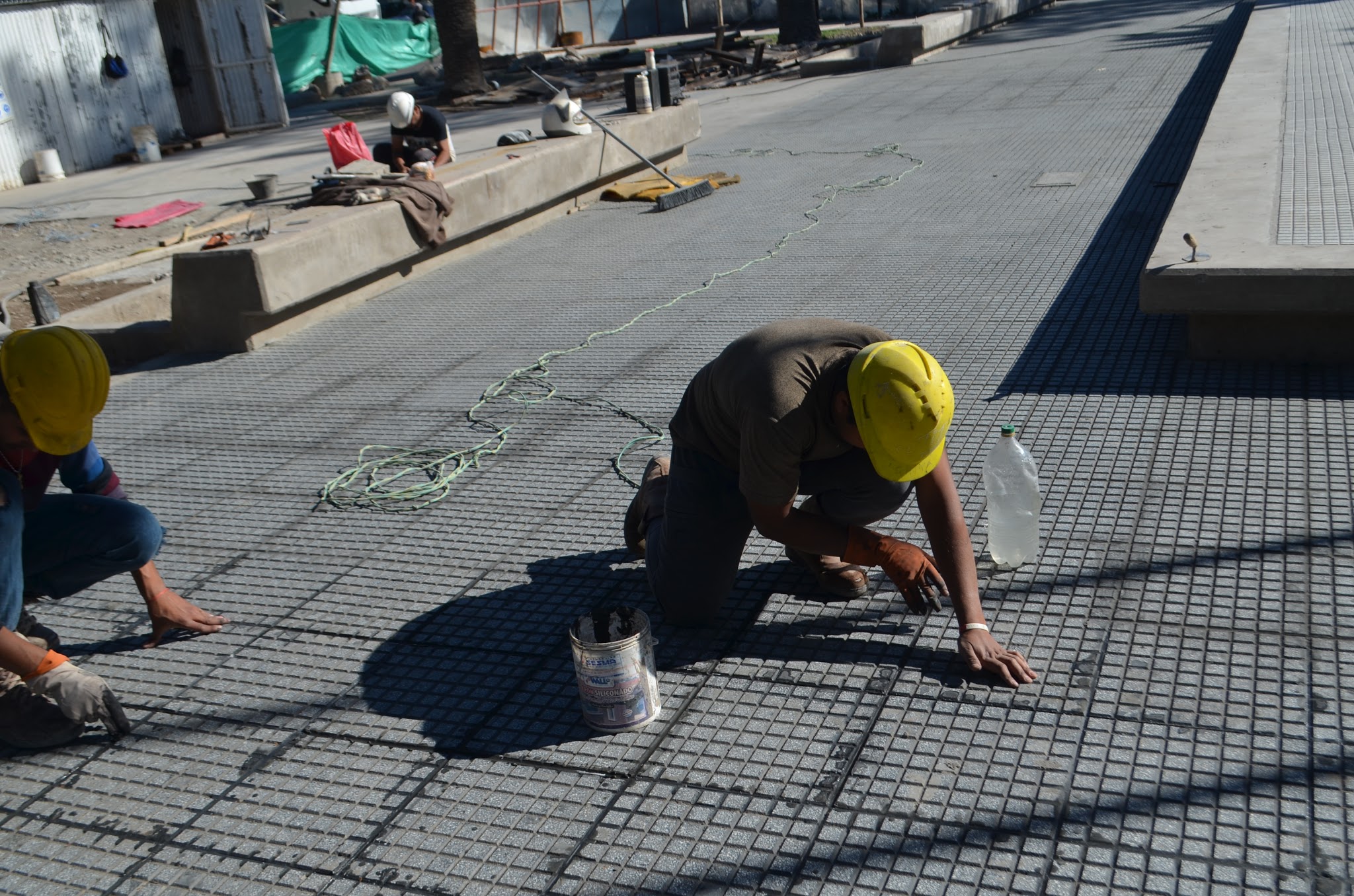 Luego de los movimientos de suelo, la construcción de bases y acequias, se colocan las baldosas para las nuevas veredas. En poco tiempo más se avanzará con el moderno y potente sistema de iluminación, los bancos, cestos para residuos y el parquizado.