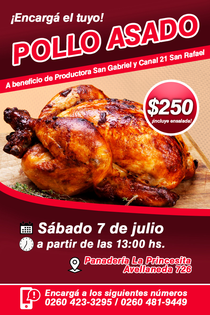 Trabajadores del Canal 21 y de la Productora San Gabriel se encuentran vendiendo pollo también, dado que la situación económica los ha llevado a tener que tomar esa decisión. En este caso, se podrán encargar pollos para ser retirados el sábado 7 de julio de la panadería ubicada en Avellaneda 726.