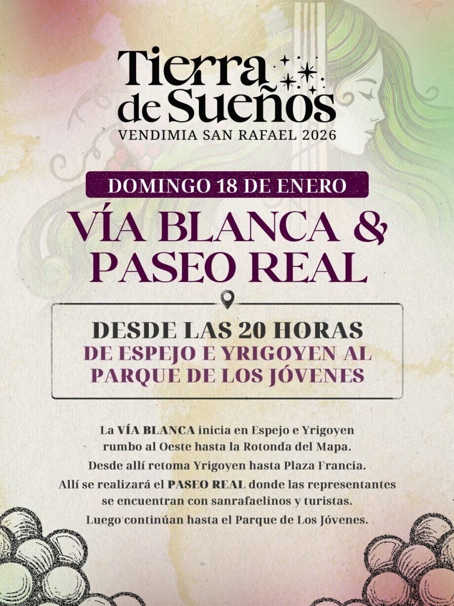 El domingo 18, será el turno de la Vía Blanca y el Paseo Real, un recorrido que inicia en Espejo e Yrigoyen y se dirige hacia el oeste hasta la Rotonda del Mapa. Desde allí retoma por Yrigoyen hasta Plaza Francia, donde se llevará a cabo el Paseo Real, con el tradicional encuentro entre las representantes vendimiales, sanrafaelinos y turistas. Luego, la actividad continúa hasta el Parque de los Jóvenes, donde seguirá la celebración.