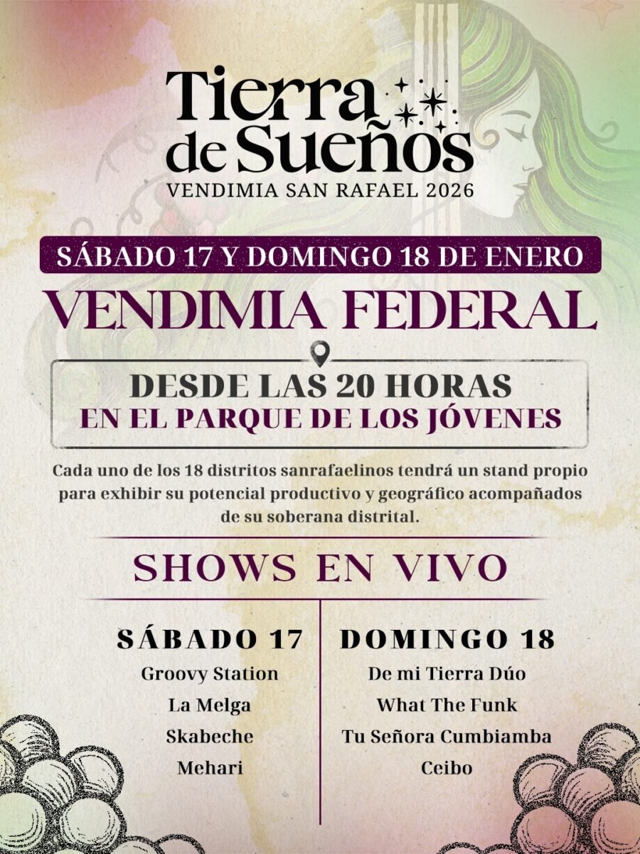 San Rafael vivirá este fin de semana uno de los momentos más fuertes del calendario vendimial con la realización de la Vendimia Federal, una celebración que reúne identidad, producción, tradiciones y cultura de los 18 distritos del departamento.
