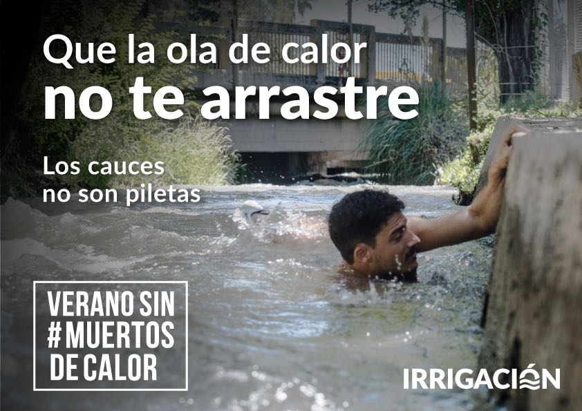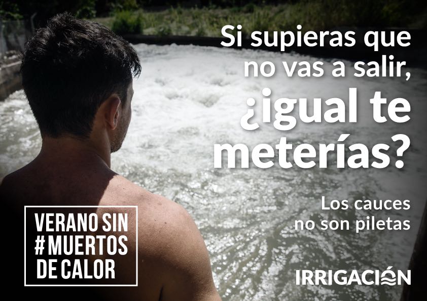 Desde esta semana está circulando la parte gráfica de la campaña denominada “Verano sin muertos de calor”, que busca generar conciencia, informando y previniendo, sobre lo que puede ocurrir tras sumergirse en cauces de riego, canales, diques y embalses no aptos para bañarse. Se trata de una campaña fuerte (como a las que apelan tanto el Gobierno Provincial como Nacional), que pone en el tapete la frase que habitualmente se usa para referirse al calor y que muchas veces se repite sin darle el valor o importancia necesaria a su significado real.