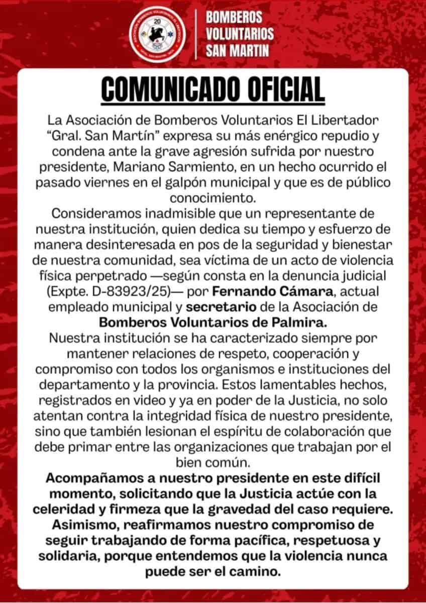 De acuerdo a la información disponible, todo comenzó cuando Sarmiento se presentó en el predio municipal para realizar un service técnico gratuito a cargo de Servicios Públicos, pero Cámara le negó la entrada. La discusión subió de tono y finalizó con un golpe que dejó tendido en el suelo al bombero de San Martín.