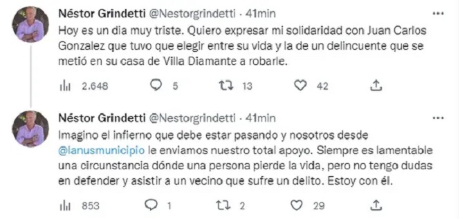 En tanto, el intendente de Lanús, envió un mensaje a través de Twitter: Néstor Grindetti, se manifestó al respecto en redes sociales. “Hoy es un día muy triste. Quiero expresar mi solidaridad con Juan Carlos González que tuvo que elegir entre su vida y la de un delincuente que se metió en su casa de Villa Diamante a robarle”.