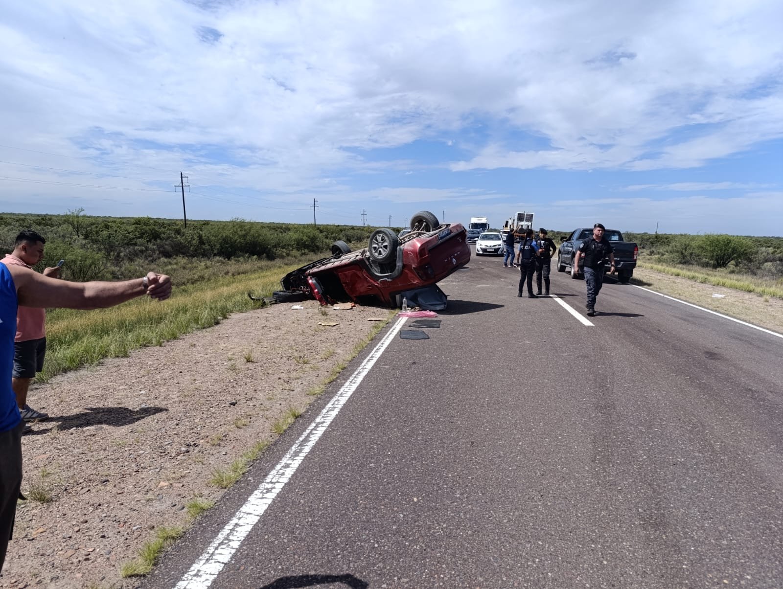 Al arribar al lugar, el personal policial constató que se trataba de una camioneta Renault Oroch de color rojo que, por causas que se intentan determinar, habría perdido el control mientras circulaba y terminó volcando tras dar varios tumbos, quedando a un costado de la banquina.