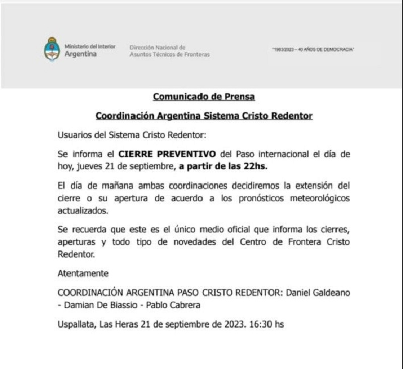 “Se informa el cierre preventivo del Paso Internacional Cristo Redentor, el día jueves 21 de septiembre a partir de las 22 hs“, anunció la Coordinación Argentina del Sistema Integrado Cristo Redentor.