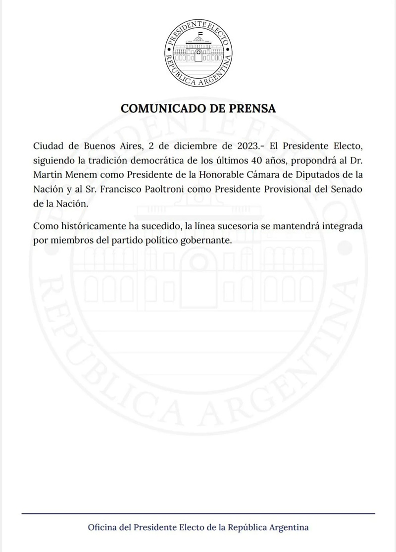 “El presidente electo, siguiendo la tradición democrática de los últimos 40 años, propondrá al Dr. Martín Menem como Presidente de la Honorable Cámara de Diputados de la Nación y al Sr. Francisco Paoltroni como Presidente Provisional del Senado de la Nación”, dice el escrito.