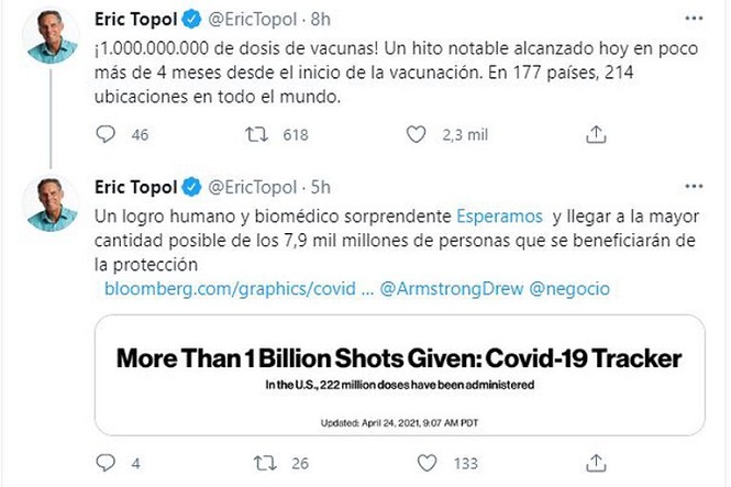 El reconocido investigador, cardiólogo y genetista Eric Topol celebró el hito histórico científico en su cuenta de Twitter: “¡1.000.000.000 de dosis de vacunas! Un hito notable alcanzado hoy en poco más de 4 meses desde el inicio de la vacunación. En 177 países, 214 ubicaciones en todo el mundo”.